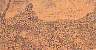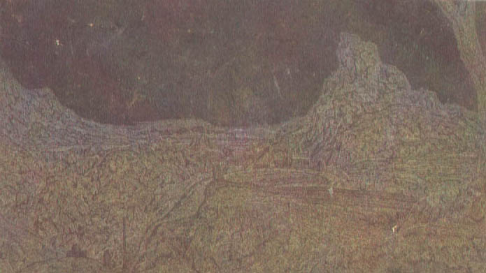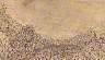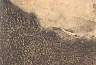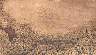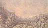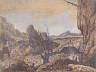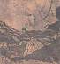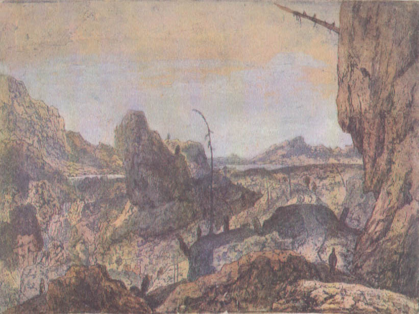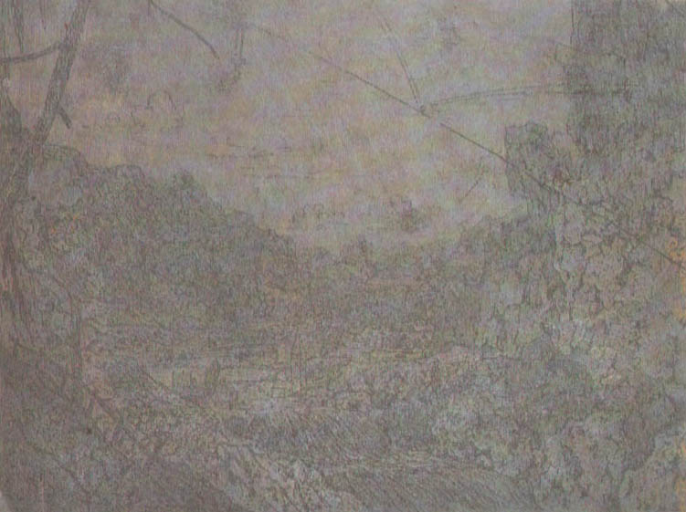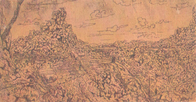 Fragmenten van het landschap zijn bruin gewassen. Er zijn sporen op het papier die