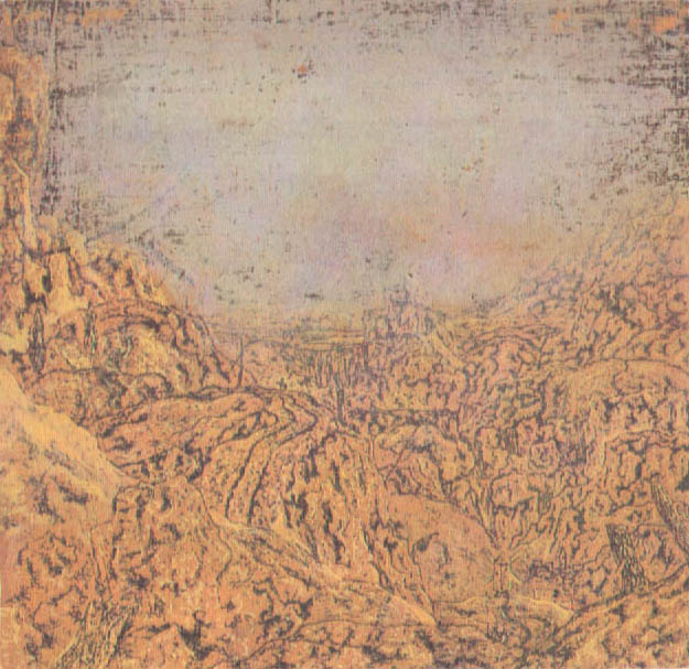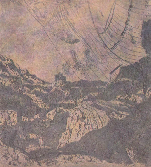 Ets, met zwart gedrukt op grijs geprepareerd linnen. Wolken en bergen (links) en de