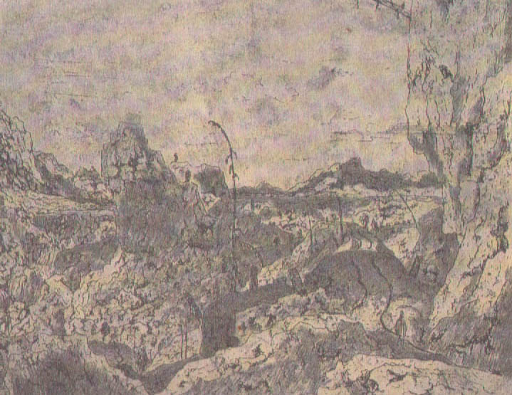 achtergrond in de verte grijs gewassen. Het midden en de rechtervoorgrond lichtbruin gewassen.