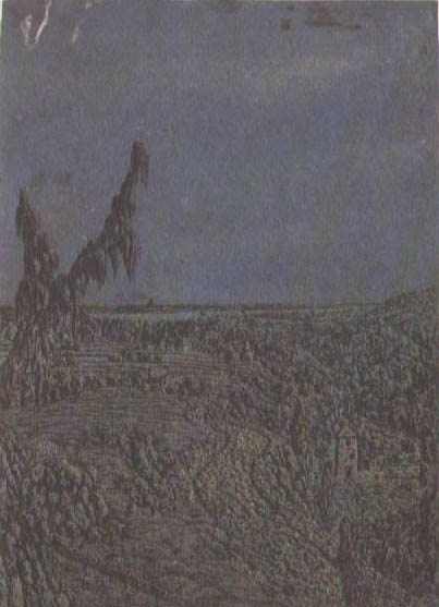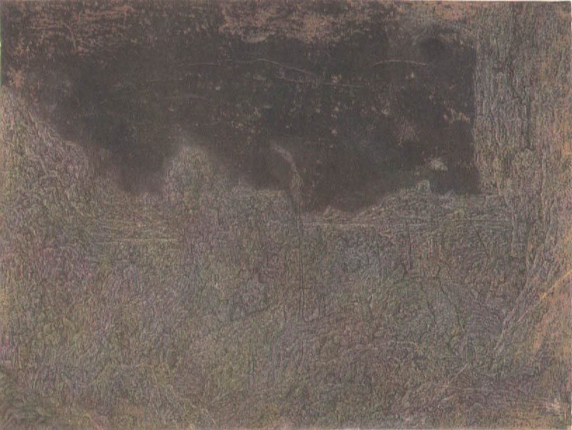 daarna overgeschilderd met verschillende tinten groen en met wat violet in de lucht.