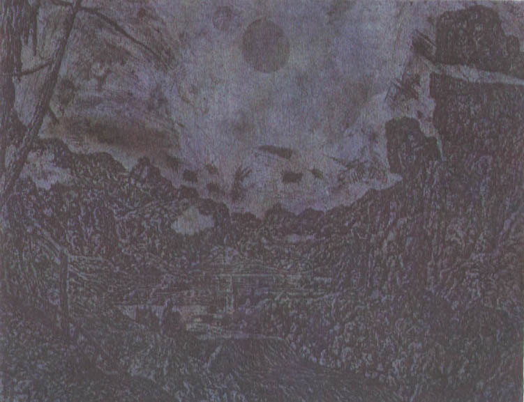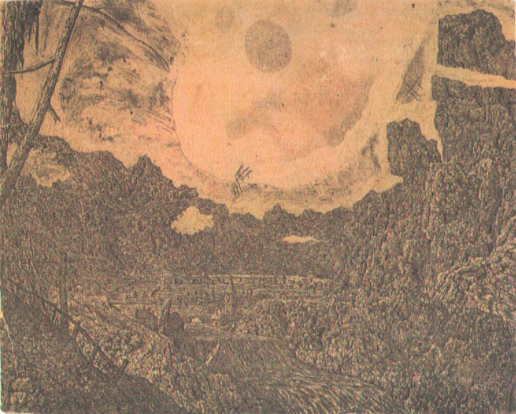 Ets, met zwart gedrukt op papier dat met blauwe waterverf werd peprepareerd.