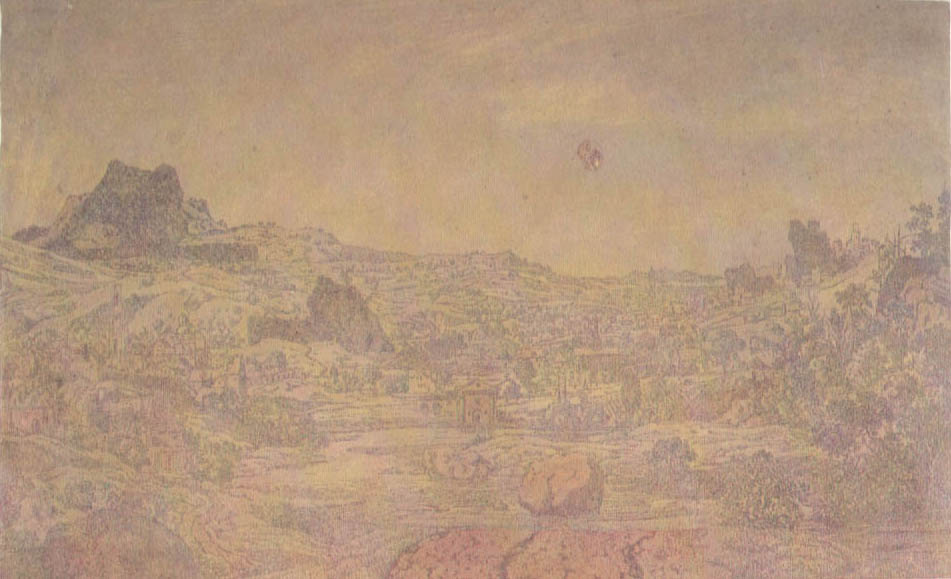 Deze druk is een proeve van de tweede staat van de prent, waarop het landschap enigszins